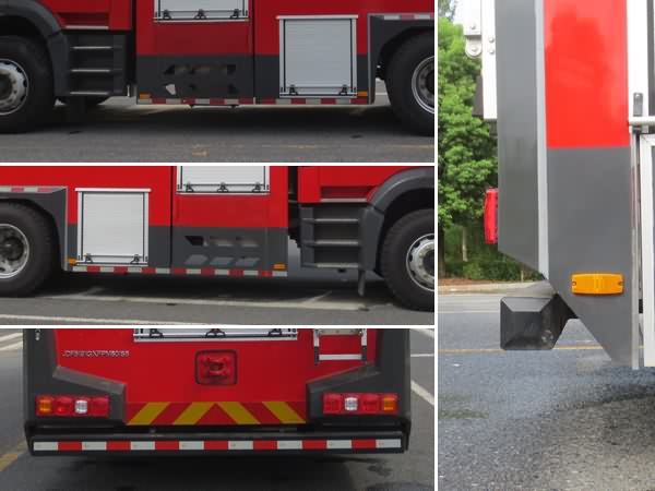 | 罐體總?cè)莘e:8.0立方米,水罐容積:5.85立方米,水罐尺寸:1735×2440×1450mm,泡沫液罐容積:2.15立方米,泡沫液罐尺寸:635×2440×1450mm。整體式側(cè)防護結(jié)構(gòu),后防護裝置材料:Q235,截面尺寸:120×120mm,與車輛連接方式:螺栓連接,后防護離地高度:400mm。ABS系統(tǒng)生產(chǎn)廠家及型號為:西安正昌電子股份有限公司(型號:ZQFB-V)。主要專用裝置有消防泵、消防炮。 | |||