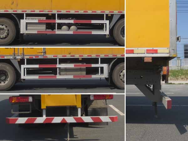 | 廂體頂部封閉,不可開啟;隨底盤選裝駕駛室;廂體側(cè)面選裝開門型式和位置;選裝瓦楞板機(jī)構(gòu)廂體以及開門型式和位置,選裝后部雙拉桿結(jié)構(gòu);選裝起重尾板,尾板質(zhì)量為550kg,起重尾板收起狀態(tài)水平長度為290mm;該車型可選裝ETC車載裝置;額定載質(zhì)量(kg)/整備質(zhì)量(kg)/準(zhǔn)乘人數(shù)(人)對應(yīng)關(guān)系為:20070/11800/2,20005/11800/3,20520/11350/2,20455/11350/3;運(yùn)輸**容器(瓶)包裝的貨物;危險貨物類項(xiàng)號:3;該車為危險品貨物運(yùn)輸車;僅采用前輪盤式制動器,前置排氣管,子午線輪胎,限速裝置的底盤,限速80km/h;后軸為空氣懸架;轉(zhuǎn)向輪安裝爆胎應(yīng)急防護(hù)裝置;發(fā)動機(jī)/油耗申報值(L/100km)對應(yīng)關(guān)系為:MC07.31-60/38.0,MC07.34-60/38.0,MC09.35-60/38.0,MC09.38-60/38.0,MC09.35B-60/38.0,MC07H.35-60/38.0;該車安裝具有衛(wèi)星定位功能的行駛記錄儀;ABS系統(tǒng)**器生產(chǎn)企業(yè)/型號為威伯科(上海)管理有限公司/4460046300;選裝EBS,EBS系統(tǒng)**器生產(chǎn)企業(yè)/型號為威伯科(上海)管理有限公司/EBS3;側(cè)面防護(hù)及后下部防護(hù)裝置材料材質(zhì):Q235,連接方式:焊接;后下部防護(hù)裝置斷面尺寸(寬×高):60×120(mm),離地高度:460mm.選裝圓形后防護(hù),連接方式:焊接加螺栓連接;斷面尺寸(直徑):120(mm),離地高度:460mm. | |||