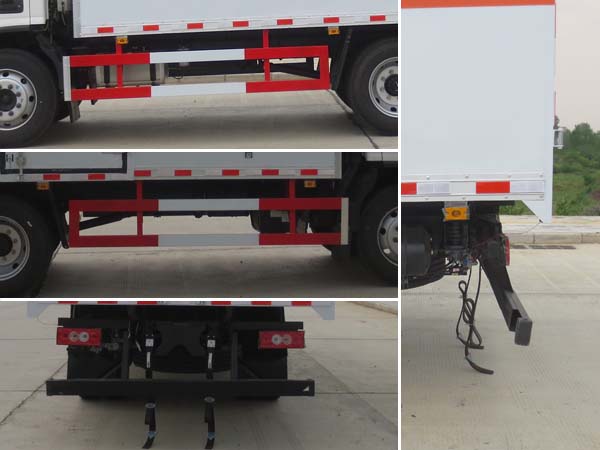 | 廂體頂部封閉,不可開啟;隨底盤選裝駕駛室,選裝儲氣筒內(nèi)置;廂體選裝瓦楞板結(jié)構(gòu),廂體側(cè)面選裝開門型式及位置或不帶側(cè)開門,選裝百葉窗;選裝起重尾板(收起狀態(tài)水平長度為290mm),尾板質(zhì)量為450kg;選裝不同廠家尾板及尾板樣式;該車用于運輸具有**容器(瓶)包裝的介質(zhì)類項號為:3;該車為危險品貨物運輸車;僅采用前輪盤式制動器,前置排氣管,子午線輪胎,限速裝置的底盤,限速80km/h;轉(zhuǎn)向輪安裝爆胎應(yīng)急防護裝置;發(fā)動機/油耗申報值(L/100km)對應(yīng)關(guān)系為:F3.8NS6B156/21.02,D30TCIF1/20.39;該車安裝具有衛(wèi)星定位功能的行駛記錄儀;ABS系統(tǒng)型號:ABS-VI.E;生產(chǎn)企業(yè):廣州瑞立科密汽車電子股份有限公司.ABS系統(tǒng)型號:ABS-E;生產(chǎn)企業(yè):威伯科汽車**系統(tǒng)(**)有限公司;側(cè)面防護及后下部防護裝置材料材質(zhì):Q235,連接方式:焊接加螺栓連接;后下部防護裝置斷面尺寸(寬×高):50×100(mm),離地高度:420mm;選裝起重尾板時,后防護連接方式:焊接加螺栓連接;后下部防護裝置斷面尺寸為:Φ120mm,離地高度:420mm;該車型可選裝ETC車載裝置. | |||