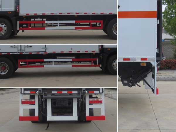 | 廂體頂部封閉,不可開啟;隨底盤選裝駕駛室,隨底盤選裝燃油箱,電瓶,尿素罐,儲(chǔ)氣筒左右安裝位置.起重尾板為選裝件(收起狀態(tài)水平長度為290mm),尾板質(zhì)量為545kg;選裝不同廠家尾板及尾板樣式;廂體側(cè)面選裝開門型式和位置,選裝不帶側(cè)開門;選裝瓦楞板結(jié)構(gòu)廂體及開門型式和位置;選裝后部結(jié)構(gòu);額定載質(zhì)量/整備質(zhì)量(kg)對(duì)應(yīng)關(guān)系為:10700/7105,9995/7810;該車用于運(yùn)輸具有**容器(瓶)包裝的危險(xiǎn)貨物類項(xiàng)號(hào):9;僅采用前輪盤式制動(dòng)器,前置排氣管,子午線輪胎,限速裝置的底盤,限速80km/h;后軸為空氣懸架;轉(zhuǎn)向輪安裝爆胎應(yīng)急防護(hù)裝置;發(fā)動(dòng)機(jī)B6.2NS6B230,D4.5NS6B220,YCS04200-68,CY4SK761油耗申報(bào)值均為26.6L/100km;該車安裝具有衛(wèi)星定位功能的行駛記錄儀;EBS系統(tǒng)生產(chǎn)廠家,型號(hào):襄陽東風(fēng)隆誠機(jī)械有限責(zé)任公司,EBS/ESC-d;側(cè)面防護(hù)及后下部防護(hù)裝置材料材質(zhì):Q235,連接方式:焊接加螺栓連接;后下部防護(hù)裝置斷面尺寸(寬×高):50×120(mm),離地高度:485mm.選裝后防護(hù)結(jié)構(gòu),斷面尺寸(直徑):Φ120(mm),離地高度:485mm.該車選裝ETC車載裝置. | |||