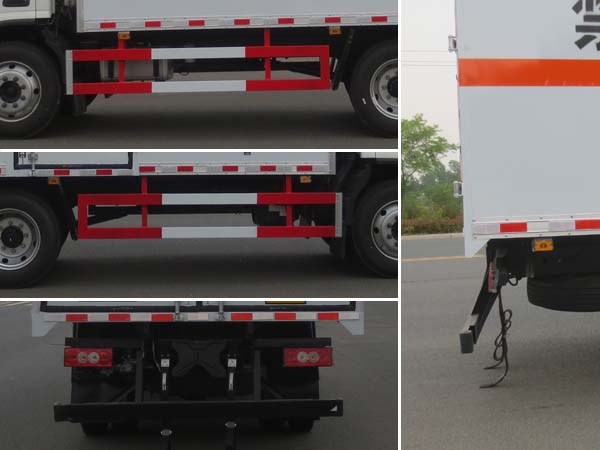 | 廂體頂部封閉,不可開啟;隨底盤選裝駕駛室,選裝儲氣筒內(nèi)置;廂體選裝瓦楞板結(jié)構(gòu),廂體側(cè)面選裝開門型式及位置或不帶側(cè)開門,選裝百葉窗;選裝起重尾板(收起狀態(tài)水平長度為290mm),尾板質(zhì)量為450kg;選裝不同廠家尾板及尾板樣式;運輸具有**容器(瓶)包裝的介質(zhì)類項號為9;該車為危險品貨物運輸車;僅采用前輪盤式制動器,前置排氣管,子午線輪胎,限速裝置的底盤,限速80km/h;轉(zhuǎn)向輪安裝爆胎應(yīng)急防護裝置;發(fā)動機/油耗申報值(L/100km)對應(yīng)關(guān)系為:F3.8NS6B156/21.02,D30TCIF1/20.39;該車安裝具有衛(wèi)星定位功能的行駛記錄儀;ABS系統(tǒng)型號:ABS-VI.E;生產(chǎn)企業(yè):廣州瑞立科密汽車電子股份有限公司.ABS系統(tǒng)型號:ABS-E;生產(chǎn)企業(yè):威伯科汽車**系統(tǒng)(**)有限公司;側(cè)面防護及后下部防護裝置材料材質(zhì):Q235,連接方式:焊接加螺栓連接;后下部防護裝置斷面尺寸(寬×高):50×100(mm),離地高度:420mm;選裝起重尾板時,后防護連接方式:焊接加螺栓連接;后下部防護裝置斷面尺寸為:Φ120mm,離地高度:420mm;該車型可選裝ETC車載裝置. | |||