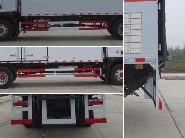 | 廂體頂部封閉,不可開啟;隨底盤選裝駕駛室;選裝燃油箱,電瓶,尿素罐,儲氣筒左右安裝位置,選裝鋁合金油箱;該車型可選裝ETC車載裝置;起重尾板為選裝件(收起狀態(tài)水平長度為290mm),尾板質量為545kg;廂體側面選裝開門型式和位置,選裝不帶側開門;額定載質量/整備質量(kg)對應關系為:10700/7105,9995/7810;該車用于運輸具有**容器(瓶)包裝的危險品貨物類項號:1.1 D,1.1B,1.1G ,1.1C,1.3C,1.4G;運送危險貨物車輛的類型:EX/Ⅲ型車輛;僅采用前輪盤式制動器,前置排氣管,子午線輪胎,限速裝置的底盤,限速80km/h;后軸為空氣懸架;轉向輪安裝爆胎應急防護裝置;發(fā)動機B6.2NS6B230,D4.5NS6B220,YCS04200-68,CY4SK761油耗申報值均為26.6L/100km;該車安裝具有衛(wèi)星定位功能的行駛記錄儀;EBS系統(tǒng)生產廠家,型號:襄陽東風隆誠機械有限責任公司,EBS/ESC-d;側面防護及后下部防護裝置材料材質:Q235,連接方式:焊接加螺栓連接;后下部防護裝置斷面尺寸(寬×高):50×120(mm),離地高度:485mm. | |||