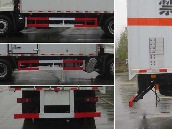 | 廂體頂部封閉,不可開啟;隨底盤選裝駕駛室,選裝后處理隔熱罩;廂體側(cè)面選裝開門型式及位置或不帶側(cè)開門;用于運(yùn)輸具有**容器(瓶)包裝的:黑火藥,壓縮黑火藥,電(非電)引爆雷管,爆破用,專用煙火制品,無煙火藥,糊狀火藥,爆破炸藥,導(dǎo)爆索,軟的,點(diǎn)燃導(dǎo)火索,射彈,帶有爆炸裝藥,聚能裝藥,不帶雷管,聚能炸藥,不帶雷管,非電引爆雷管組件,爆破用,油井用彈藥筒,固態(tài)推進(jìn)劑,動力裝置用彈藥筒,商品爆炸裝藥,不帶雷管.運(yùn)送爆炸品的項(xiàng)號:1.1 D,1.1 D,1.1B,1.1B,1.1G ,1.1C,1.3C,1.1 D,1.1 D,1.4G,1.1D,1.1 D,1.1B,1.1B,1.3C,1.1C,1.3C,1.1D;運(yùn)送危險貨物車輛的類型:EX/Ⅲ型車輛;僅采用前輪盤式制動器,前置排氣管,子午線輪胎,限速裝置的底盤,限速80km/h;轉(zhuǎn)向輪安裝爆胎應(yīng)急防護(hù)裝置;后軸采用空氣懸架;發(fā)動機(jī)/油耗申報(bào)值(L/100km)對應(yīng)關(guān)系為:B6.2NS6B210/25.9,DDi50E190-60/25.9;該車安裝具有衛(wèi)星定位功能的行駛記錄儀;EBS型號/生產(chǎn)廠家:EBS5/東科克諾爾商用車制動系統(tǒng)(十堰)有限公司;側(cè)面防護(hù)及后下部防護(hù)裝置材料材質(zhì):Q235,連接方式:焊接加螺栓連接;后下部防護(hù)裝置斷面尺寸(寬×高):50×120(mm),離地高度:495mm. | |||