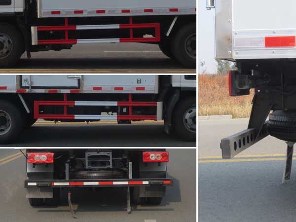 | 廂體頂部封閉,不可開啟;廂體側(cè)面選裝開門型式及位置,選裝不帶側(cè)開門,選裝瓦楞板結(jié)構(gòu);選裝起重尾板(收起狀態(tài)水平長度為290mm),尾板質(zhì)量為450kg;該車用于運(yùn)輸具有**容器(瓶)包裝的危險(xiǎn)貨物類項(xiàng)號(hào)為:2.1,2.2;該車為危險(xiǎn)品貨物運(yùn)輸車;僅采用前輪盤式制動(dòng)器,前置排氣管,子午線輪胎,限速裝置的底盤,限速80km/h;發(fā)動(dòng)機(jī)/油耗申報(bào)值(L/100km)對應(yīng)關(guān)系為:F3.8NS6B156/16.20,CY4SK261/16.09,D30TCIF1/16.19,F2.8NS6B156/15.39;該車安裝具有衛(wèi)星定位功能的行駛記錄儀;ABS系統(tǒng)型號(hào):ABS-VI.E;生產(chǎn)企業(yè):廣州瑞立科密汽車電子股份有限公司.ABS系統(tǒng)型號(hào):ABS-E;生產(chǎn)企業(yè):威伯科汽車**系統(tǒng)(**)有限公司;側(cè)面防護(hù)及后下部防護(hù)裝置材料材質(zhì):Q235,連接方式:焊接加螺栓連接;后下部防護(hù)裝置斷面尺寸(寬×高):50×100(mm),離地高度:460mm;選裝圓形后防護(hù),連接方式:焊接加螺栓連接;后下部防護(hù)裝置斷面尺寸為:Φ110mm,離地高度:410mm;該車選裝ETC. | |||