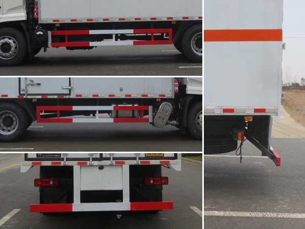 | 廂體頂部封閉,不可開啟;隨底盤選裝駕駛室,選裝后處理隔熱罩;選裝起重尾板(收起狀態(tài)水平長度為290mm),尾板質(zhì)量為545kg;選裝不同廠家尾板及尾板樣式;廂體側面選裝開門型式和位置,選裝不帶側開門;選裝瓦楞板結構及開門型式,選裝后部結構;額定載質(zhì)量/整備質(zhì)量(kg)對應關系為:10600/7205,9995/7810;運輸**容器(瓶)包裝的貨物;危險貨物類項號:2.1,2.2;僅采用前輪盤式制動器,前置排氣管,子午線輪胎,限速裝置的底盤,限速80km/h;后軸為空氣懸架;轉向輪安裝爆胎應急防護裝置; 發(fā)動機/油耗申報值(L/100km)對應關系為:B6.2NS6B210/25.9,DDi50E190-60/25.9;該車安裝具有衛(wèi)星定位功能的行駛記錄儀;EBS型號/生產(chǎn)廠家:EBS5/東科克諾爾商用車制動系統(tǒng)(十堰)有限公司;側面防護及后下部防護裝置材料材質(zhì):Q235,連接方式:焊接加螺栓連接;后下部防護裝置斷面尺寸(寬×高):50×120(mm),離地高度:495mm;選裝起重尾板時,后下部防護裝置斷面尺寸(直徑):Φ120(mm),離地高度:495mm;該車型可選裝ETC車載裝置. | |||