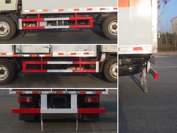 | 廂體頂部封閉,不可開啟;廂體選裝瓦楞板結(jié)構(gòu),廂體側(cè)面選裝開門型式及位置或不帶側(cè)開門,選裝百葉窗;選裝起重尾板(收起狀態(tài)水平長度為280mm),尾板質(zhì)量為350kg;運(yùn)輸**容器(瓶)包裝的貨物;危險(xiǎn)貨物類項(xiàng)號:2.1,2.2;該車為危險(xiǎn)品貨物運(yùn)輸車;僅采用前輪盤式制動器,前置排氣管,子午線輪胎,限速裝置的底盤,限速80km/h;轉(zhuǎn)向輪安裝爆胎應(yīng)急防護(hù)裝置;發(fā)動機(jī)與油耗申報(bào)值(L/100km)對應(yīng)關(guān)系為:JX4D30B6H/11.1,JX4D30A6H/11.4,JX4D30C6H/11.4;該車安裝具有衛(wèi)星定位功能的行駛記錄儀;液剎ABS系統(tǒng)型號:APG3550500A,ABS系統(tǒng)生產(chǎn)廠家:浙江亞太機(jī)電股份有限公司;氣剎ABS系統(tǒng)型號: VIE ABS-II,ABS系統(tǒng)生產(chǎn)廠家: 浙江萬安科技股份有限公司;側(cè)面防護(hù)及后下部防護(hù)裝置材料材質(zhì):Q235,連接方式:焊接加螺栓連接;后下部防護(hù)裝置斷面尺寸(寬×高):50×100(mm),離地高度:460mm;該車型可選裝ETC車載裝置. | |||
