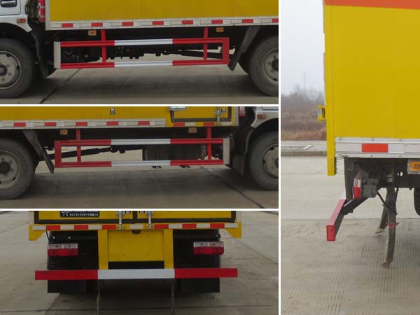 | 廂體頂部封閉,不可開(kāi)啟;隨底盤選裝駕駛室,選裝輪輞樣式,選裝燃油箱,電瓶,尿素罐,儲(chǔ)氣筒左右安裝位置;選裝起重尾板(收起狀態(tài)水平長(zhǎng)度為290mm),尾板質(zhì)量為450kg;選裝不同廠家尾板以及尾板外觀;廂體選裝瓦楞板結(jié)構(gòu),廂體側(cè)面選裝開(kāi)門型式及位置或不帶側(cè)開(kāi)門,選裝百葉窗;僅采用底盤3800mm軸距;運(yùn)輸介質(zhì)類項(xiàng)號(hào)為:2.1,2.2;該車為危險(xiǎn)品貨物運(yùn)輸車;僅采用前輪盤式制動(dòng)器,前置排氣管,子午線輪胎,限速裝置的底盤,限速80km/h;轉(zhuǎn)向輪安裝爆胎應(yīng)急防護(hù)裝置;發(fā)動(dòng)機(jī)YCS04190-68,D25TCIF1,D30TCIF1,D40TCIF1,NV30-C6D,CY4SK261,CY4SK361,YCY30165-60對(duì)應(yīng)油耗申報(bào)值均為:21.3L/100km;該車安裝具有衛(wèi)星定位功能的行駛記錄儀;ABS型號(hào)/廠家:ABS型號(hào):ABS/ASR-24V-4S/4M,廠家:襄陽(yáng)東風(fēng)隆誠(chéng)機(jī)械有限責(zé)任公司;側(cè)面防護(hù)及后下部防護(hù)裝置材料材質(zhì):Q235,連接方式:焊接加螺栓連接;后下部防護(hù)裝置斷面尺寸(寬×高):45×100(mm),離地高度:460mm;選裝圓形后防護(hù),連接方式:焊接加螺栓連接;后下部防護(hù)裝置斷面尺寸為:Φ110mm,離地高度:400mm;該車型可選裝ETC車載裝置. | |||