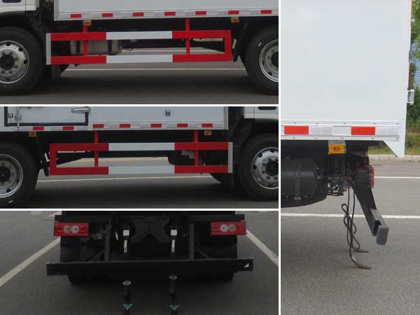 | 廂體頂部封閉,不可開啟;隨底盤選裝駕駛室,選裝儲氣筒內(nèi)置;選裝起重尾板(收起狀態(tài)水平長度為290mm),尾板質(zhì)量為450kg;選裝不同廠家尾板及尾板樣式;廂體選裝瓦楞板結(jié)構(gòu),廂體側(cè)面選裝開門型式及位置或不帶側(cè)開門,選裝百葉窗;該車型可選裝ETC車載裝置;該車用于運輸具有**容器(瓶)包裝的危險貨物類項號為:2.1,2.2;該車為危險品貨物運輸車;僅采用前輪盤式制動器,前置排氣管,子午線輪胎,限速裝置的底盤,限速80km/h;轉(zhuǎn)向輪安裝爆胎應(yīng)急防護裝置;發(fā)動機/油耗申報值(L/100km)對應(yīng)關(guān)系為:F3.8NS6B156/21.02,D30TCIF1/20.39;該車安裝具有衛(wèi)星定位功能的行駛記錄儀;ABS系統(tǒng)型號:ABS-VI.E;生產(chǎn)企業(yè):廣州瑞立科密汽車電子股份有限公司.ABS系統(tǒng)型號:ABS-E;生產(chǎn)企業(yè):威伯科汽車**系統(tǒng)(**)有限公司;側(cè)面防護及后下部防護裝置材料材質(zhì):Q235,連接方式:焊接加螺栓連接;后下部防護裝置斷面尺寸(寬×高):50×100(mm),離地高度:420mm;選裝圓形后防護,連接方式:焊接加螺栓連接;后下部防護裝置斷面尺寸為:Φ120mm,離地高度:420mm; | |||